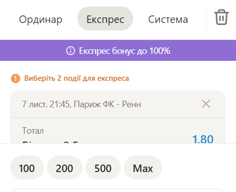 Ставки прематч и лайв рассчитываются по единой формуле: выигрыш = сумма ставки × коэффициент. При экспрессах используется перемножение, при ординарах — прямое умножение. Букмекер предусматривает автоматическое удержание налога на выигрыш с сумм, превышающих 7 500 гривен.